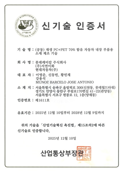 ㈜서연이화는 현대자동차 및 롯데케미칼과 공동으로 개발한 ‘재생 PC+PET 70% 함유 자동차 내장 부품용 소재 제조 기술’로2025년 제3회 신기술(NET, New Excellent Technology) 인증을 획득하였습니다.
